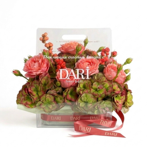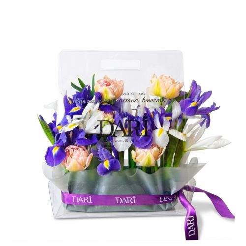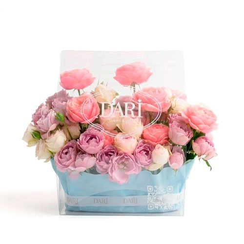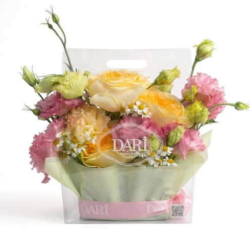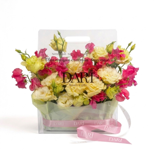 Элегантный и современный формат цветочного подарка. Прозрачная сумка не только подчеркивает хрупкость цветов, но и служит стильным аксессуаром, который удобно нести. Цветы зафиксированы в специальной флористической губке, поэтому они получают необходимое увлажнение и остаются свежими максимально долго.
