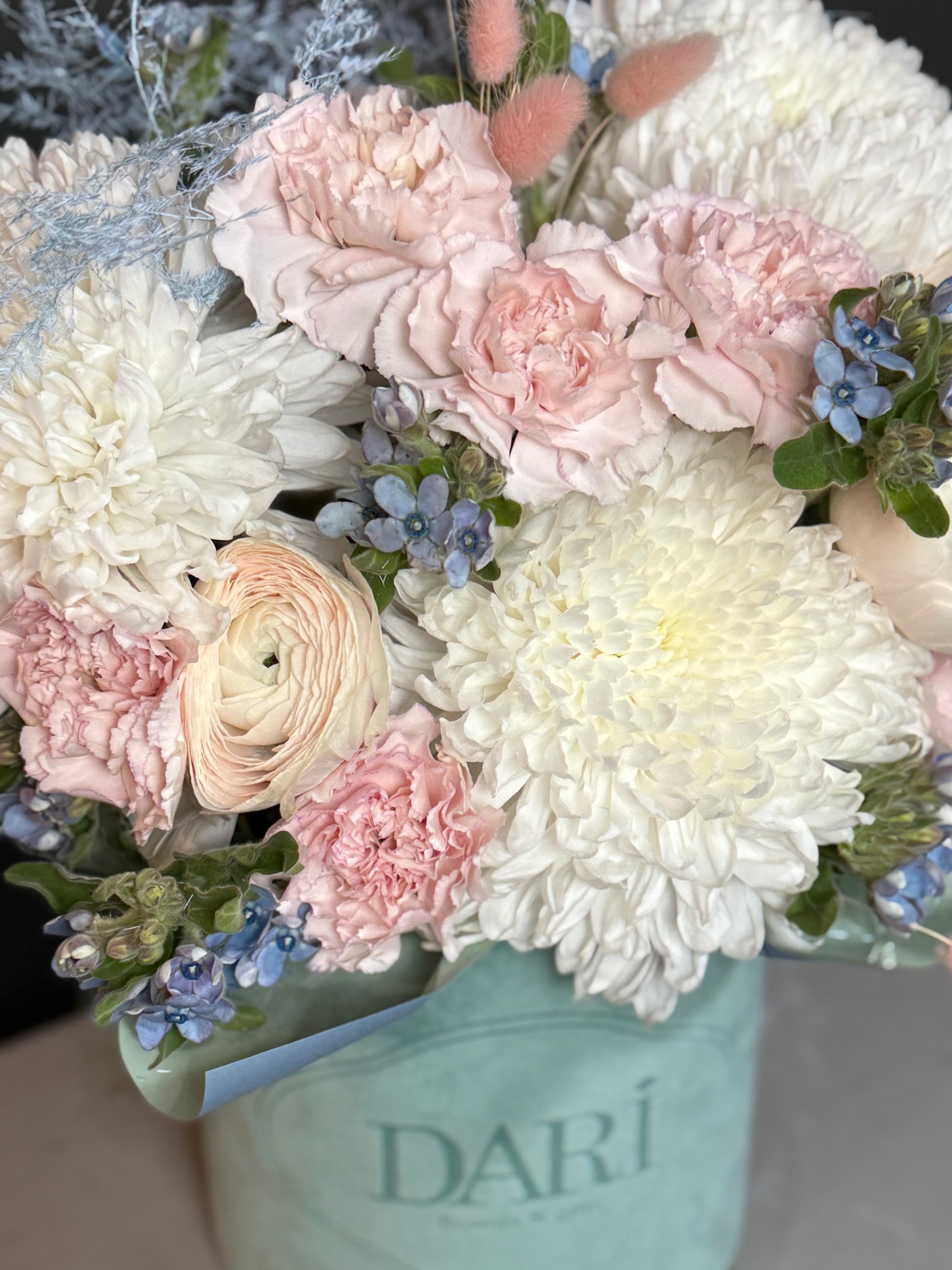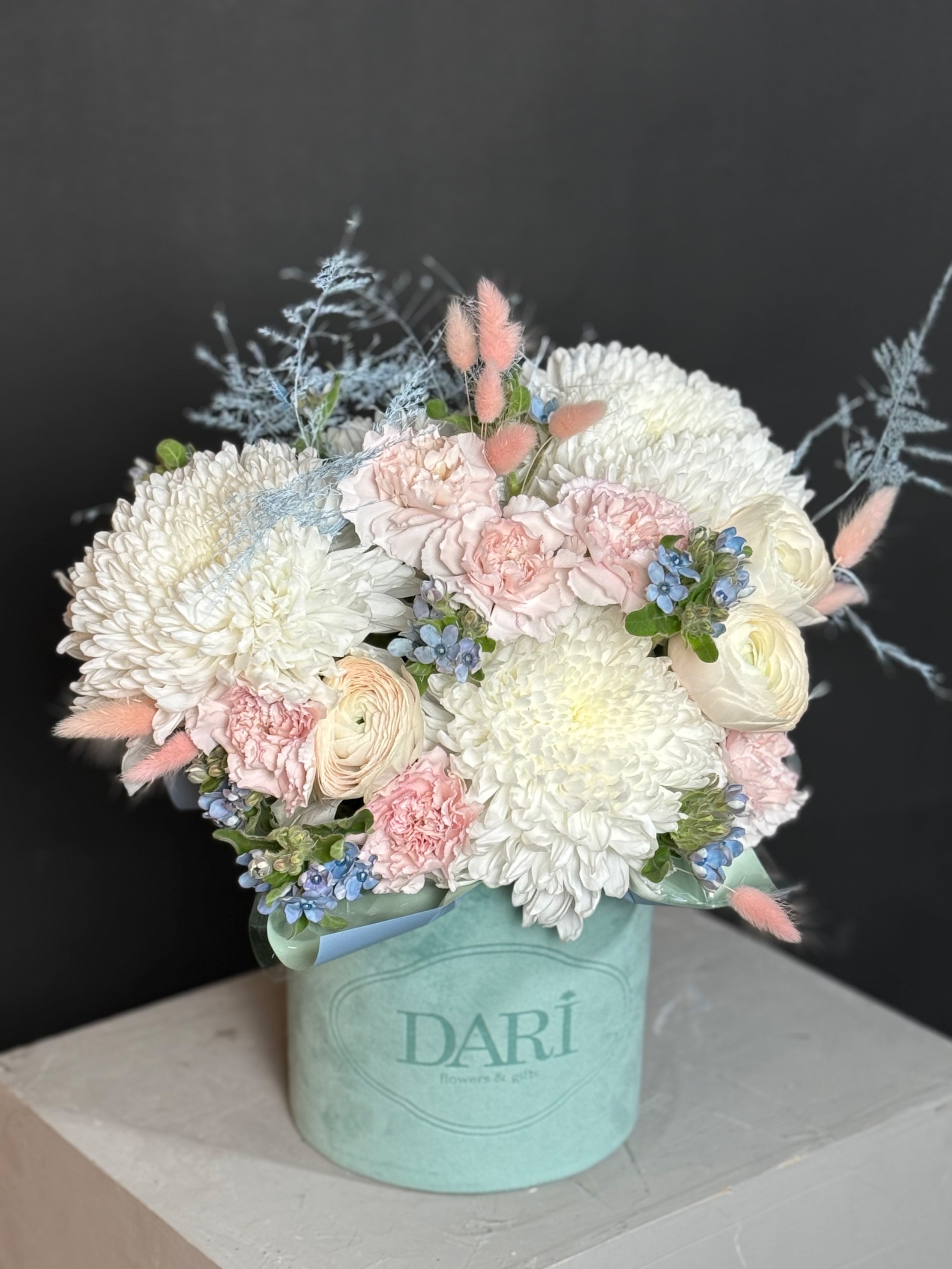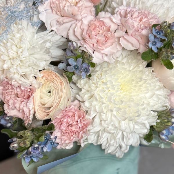 Нежная, воздушная композиция в мягких оттенках, выполненная в легком и романтичном стиле. Букет привлекает своей деликатностью и гармоничным сочетанием полутонов, создавая образ утонченный и сдержанно-элегантный.