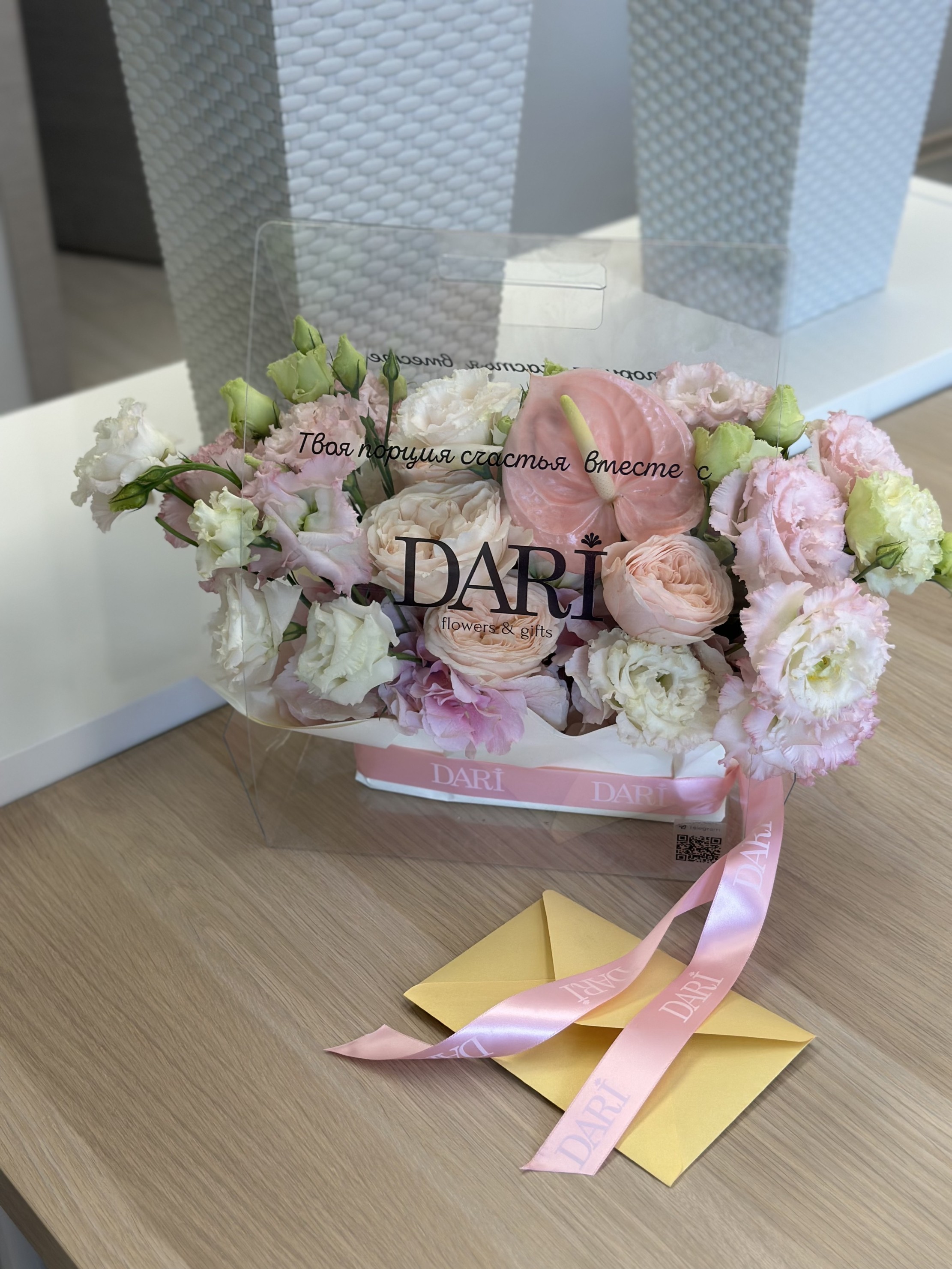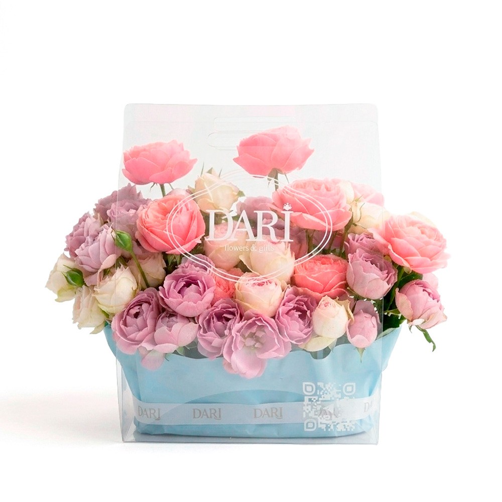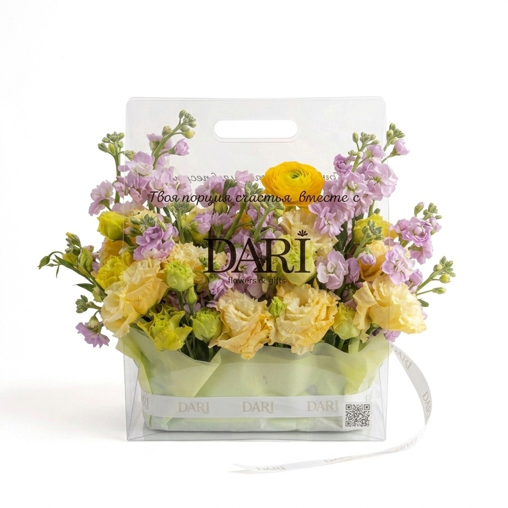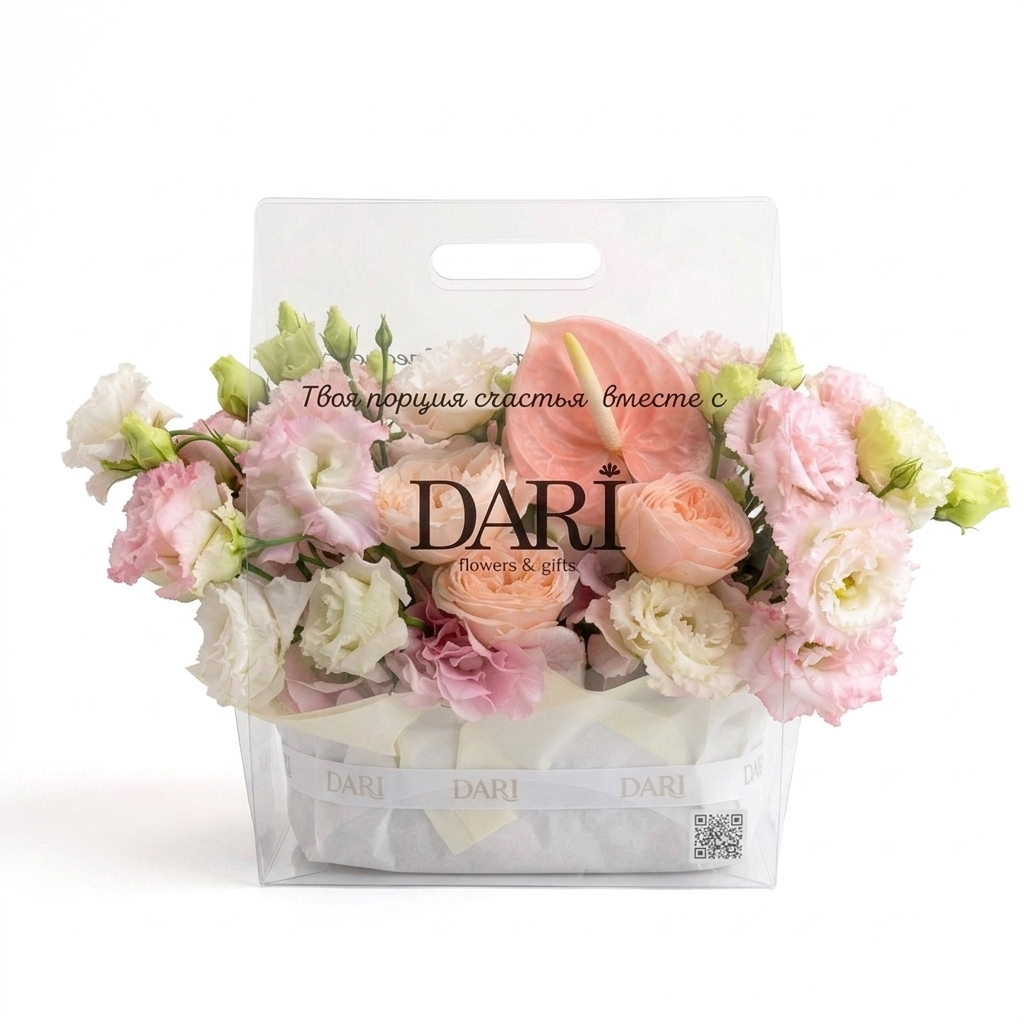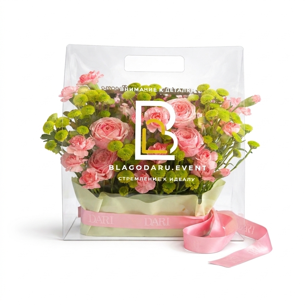 Авторские открытки с любым текстом или вашим логотипом, а также брендированные ленты из сатина или трендового силикона для каждого подарка. Доступна износостойкая цветная или белая УФ-печать имени или бренда прямо на сумке, а при заказе партии композиций возможно нанесение индивидуальных надписей и различных изображений для каждого конкретного получателя.
