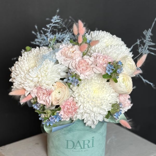 Нежная, воздушная композиция в мягких оттенках, выполненная в легком и романтичном стиле. Букет привлекает своей деликатностью и гармоничным сочетанием полутонов, создавая образ утонченный и сдержанно-элегантный.