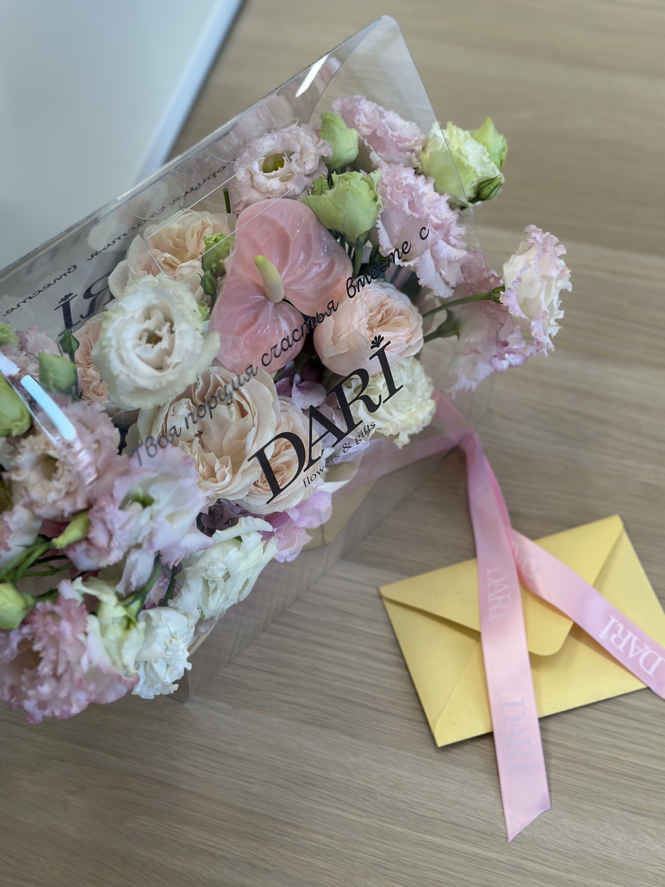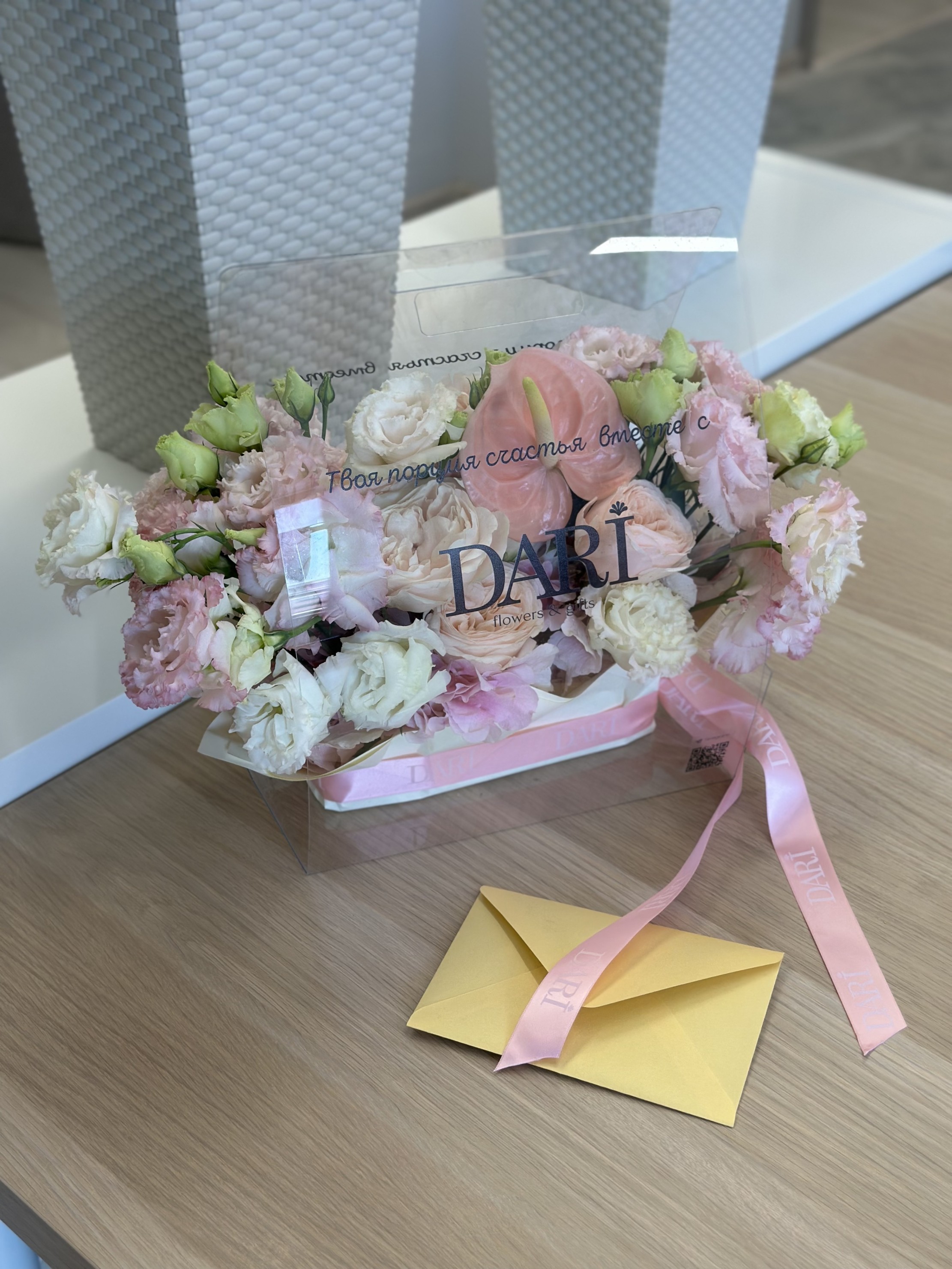 Авторские открытки с любым текстом или вашим логотипом, а также брендированные ленты из сатина или трендового силикона для каждого подарка. Доступна износостойкая цветная или белая УФ-печать имени или бренда прямо на сумке, а при заказе партии композиций возможно нанесение индивидуальных надписей и различных изображений для каждого конкретного получателя.